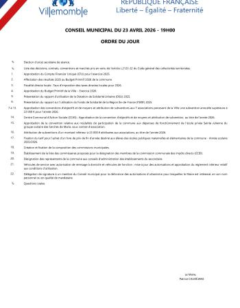 Le Conseil Municipal se réunit au moins une fois par trimestre. Prochaine séance du Conseil municipal Jeudi 23 avril 2026 à 19h, salle du Conseil. Ordre du jour Ordre du jour du Conseil municipal du 23 avril 2026 Consult Size: 288.64 KB Extension: pdf Published at 17 Apr. 2026 Tableau des commissions Tableau des commissions municipales Consult Size: 124.39 KB Extension: pdf Retrouvez : les comptes-rendus & procès-verbaux ainsi que les délibérations des Conseils municipaux.