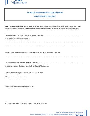 - Pour les parents séparés, avec ou sans jugement, le parent dépositaire de la demande d’inscription doit fournir une autorisation parentale écrite du parent détenteur de l’autorité parentale ne faisant pas partie du foyer, accompagnée de la photocopie de sa pièce d’identité (formulaire Autorisation parentale de scolarisation à télécharger ci-dessous :