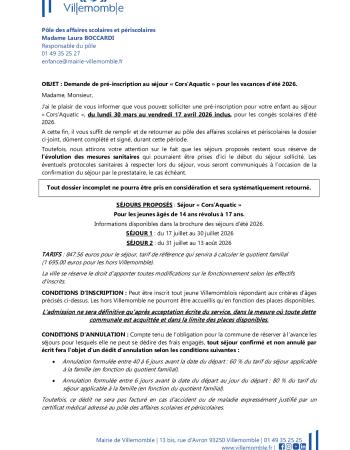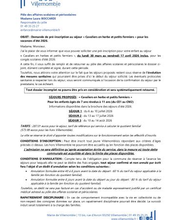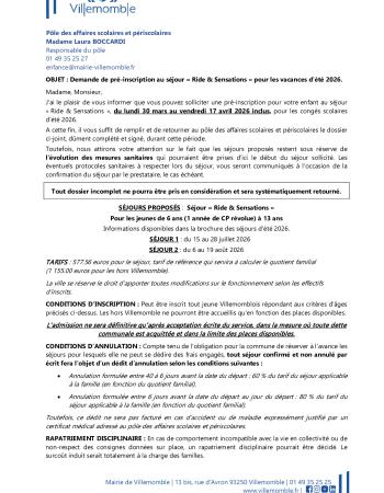 Peut être inscrit tout jeune villemomblois répondant aux critères d’âges précisés dans la brochure. Les hors Villemomble ne pourront être accueillis qu’en fonction des places disponibles.