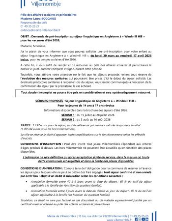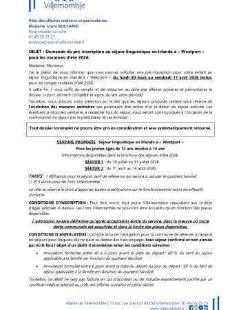La Ville propose une variété de séjours offrant à nos jeunes villemomblois l'opportunité de profiter pleinement des plaisirs de l'été. Que ce soit à l’étranger, en bord de mer, à la campagne ou en montagne, chaque séjour permet aux jeunes de s’adonner à une multitude d'activités, pouvant allier sport, découverte, pratique de la langue anglaise et détente.