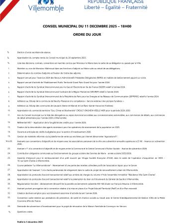 Le Conseil Municipal se réunit au moins une fois par trimestre. Prochaine séance du Conseil municipal Jeudi 11 décembre à 18h, salle du Conseil. Ordre du jour Ordre du jour du Conseil municipal du 11 décembre 2025 Consulter Taille: 438.56 Ko Extension: pdf Publié le 05 Déc. 2025 Tableau des commissions Tableau des commissions municipales Consulter Taille: 124.39 Ko Extension: pdf Retrouvez : les comptes-rendus & procès-verbaux ainsi que les délibérations des Conseils municipaux.