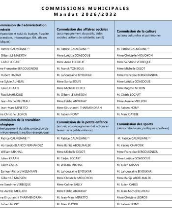 Le Conseil Municipal se réunit au moins une fois par trimestre. Prochaine séance du Conseil municipal A venir. Tableau des commissions Liste des commissions municipales et de leurs membres Consulter Taille : 145.36 Ko Extension du fichier : pdf Publié le 28 Avr. 2026 Retrouvez : les comptes-rendus & procès-verbaux ainsi que les délibérations des Conseils municipaux.